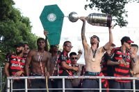 Taça da Libertadores aparece remendada em festa do título do Flamengo