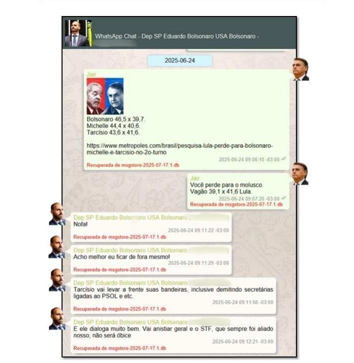 A Polícia Federal (PF) recuperou conversas entre o ex-presidente Jair Bolsonaro e o deputado federal Eduardo Bolsonaro (PL-SP), durante investigação sobre suposta intervenção da dupla nos Estados Unidos.
