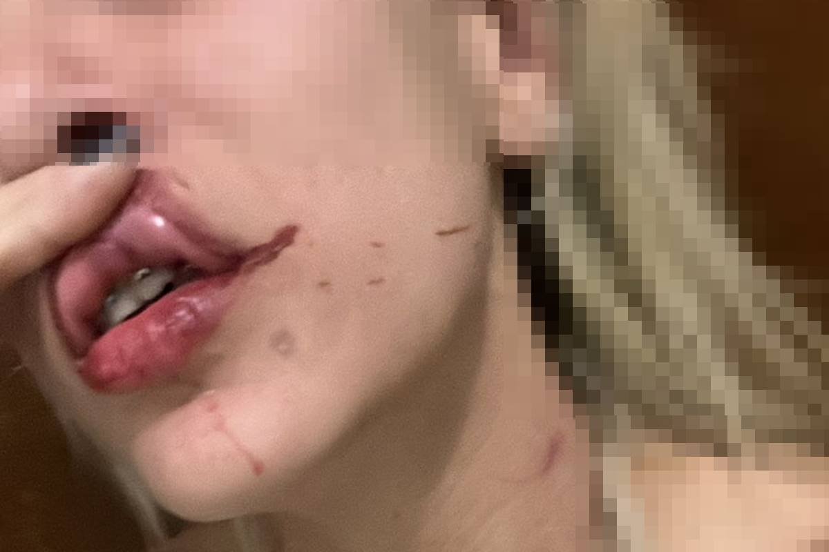 Boca ferida, sangue pelo rosto e roxo no pescoço da mulher