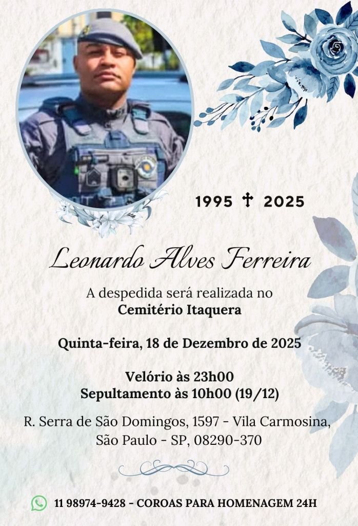 O corpo do soldado da PMESP (Polícia Militar do Estado de São Paulo) Leonardo Alves Ferreira, que morreu após ser baleado no peito e na cabeça, será velado na manhã desta sexta-feira (19), às 10h.