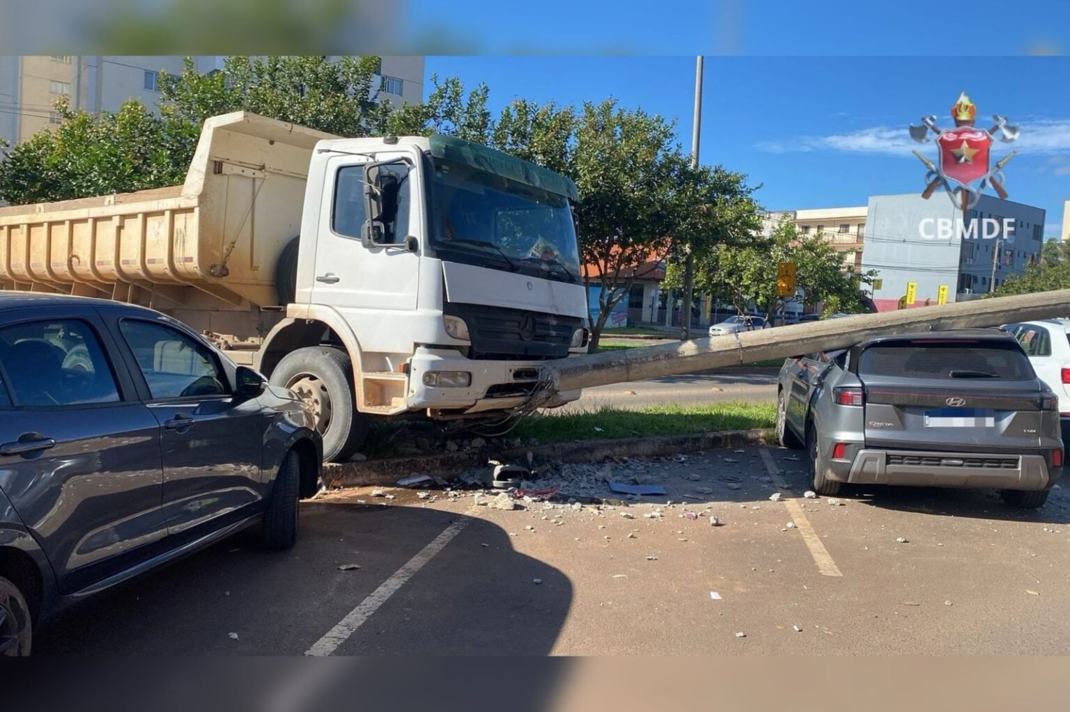 Um caminhão colidiu contra um poste de iluminação pública na manhã desta quarta-feira (9/4), na Avenida Areal – QS 05, em Taguatinga. O impacto da batida derrubou o poste, que acabou atingindo um carro que estava estacionado nas proximidades.