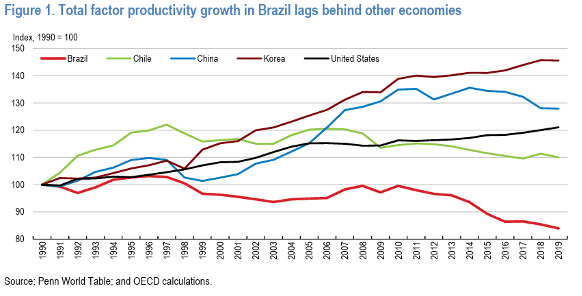 Em um recente working paper intitulado “The reform of Brazil’s consumption tax system: A historic achievement”, a OCDE reconheceu a relação entre produtividade e tributação.[1] Mais especificamente, a OCDE demonstrou que muito embora o Brasil tenha experienciado um crescimento econômico notável nas últimas décadas, tal crescimento não foi acompanhado de um aumento de produtividade, como atesta o seguinte gráfico produzido pela organização: