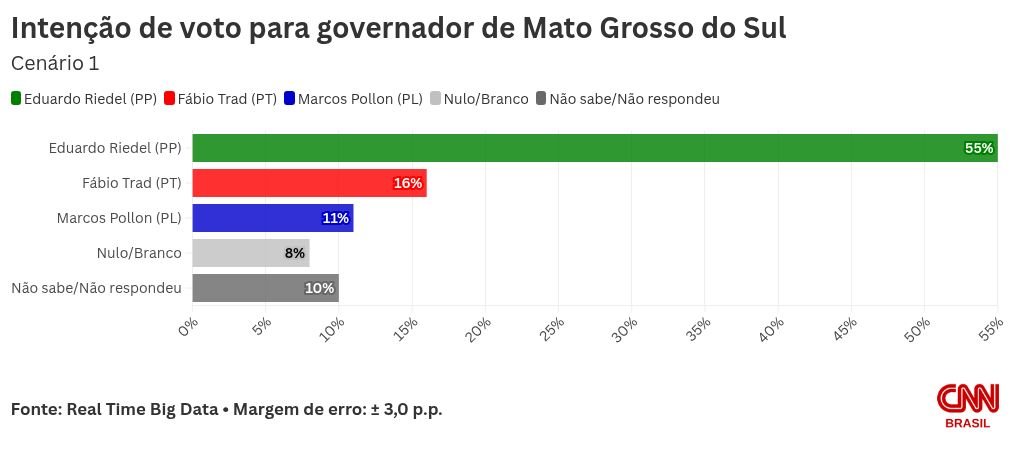 No primeiro cenário, Riedel desponta com 55%, em seguida o ex-deputado federal Fábio Trad (PT) tem 16%. O deputado federal Marcos Pollon (PL) soma 11%.