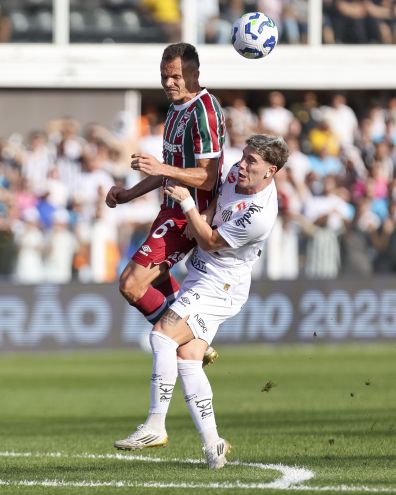 3 de 6René, do Fluminense, cabeceia contra Rollheiser, do Santos, durante a partida do Brasileirão 2025 • Ricardo Moreira/Getty Images