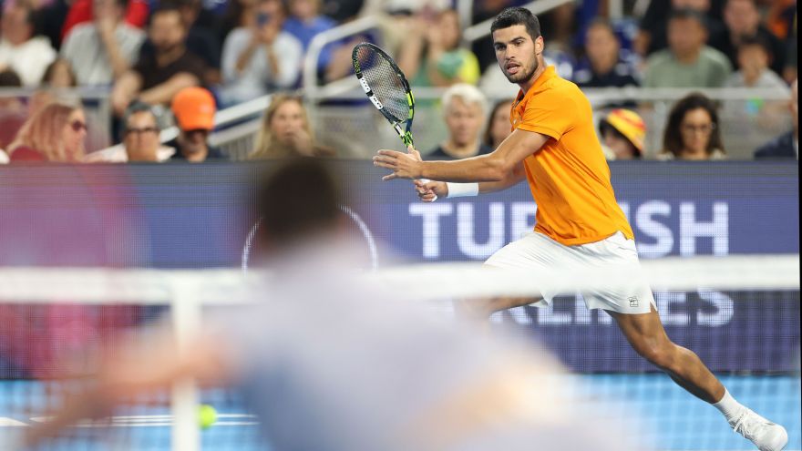 3 de 8Lance da partida entre Carlos Alcaraz e João Fonseca pelo Miami Invitational presented by Itaú • Tomas Diniz Santos/Getty Images