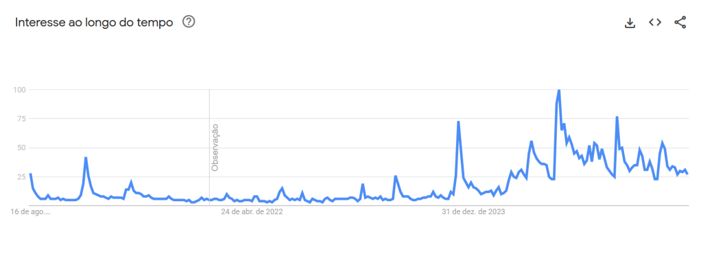 O valor de 100 presente no gráfico de pesquisa representa maior pico de popularidade de um termo. Um valor de 50 significa metade da popularidade e a pontuação pontuação de 0 significa que não havia dados suficientes sobre o termo.