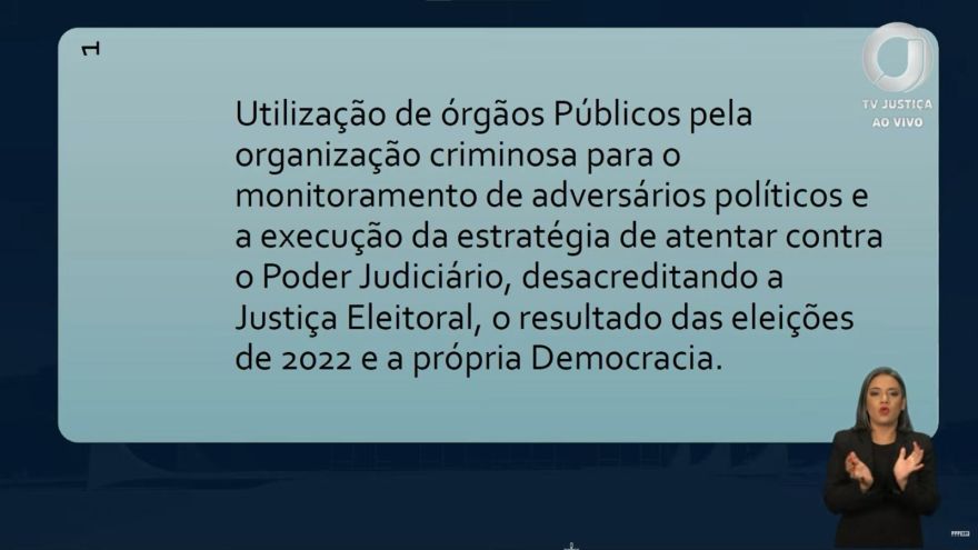O ministro afirmou que a organização criminosa teve claro objetivo de “impedir e restringir o pleno exercício dos Poderes Constituídos”, em especial o Poder Judiciário, por meio do Supremo e do TSE (Tribunal Superior Eleitoral), bem como tentar impedir a posse ou depor o governo eleito em 2022.