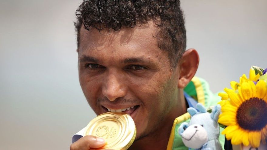 4 de 23TOKYO, JAPAN – AUGUST 07: Isaquias Queiroz dos Santos of Team Brazil celebrates winning the gold medal in the Men’s Canoe Single 1000m Final A on day fifteen of the Tokyo 2020 Olympic Games at Sea Forest Waterway on August 07, 2021 in Tokyo, Japan. (Photo by Phil Walter/Getty Images) • Phil Walter / Getty Images