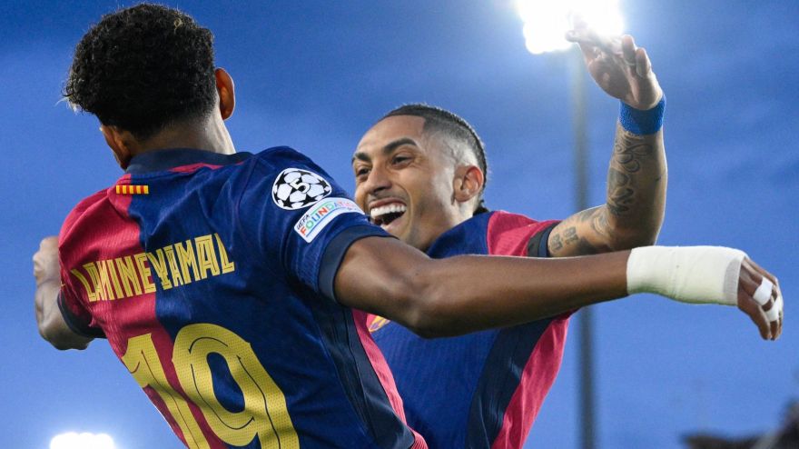 5 de 10Yamal e Raphinha comemoram gol do Barcelona • Foto: Divulgação/ @ChampionsLeague