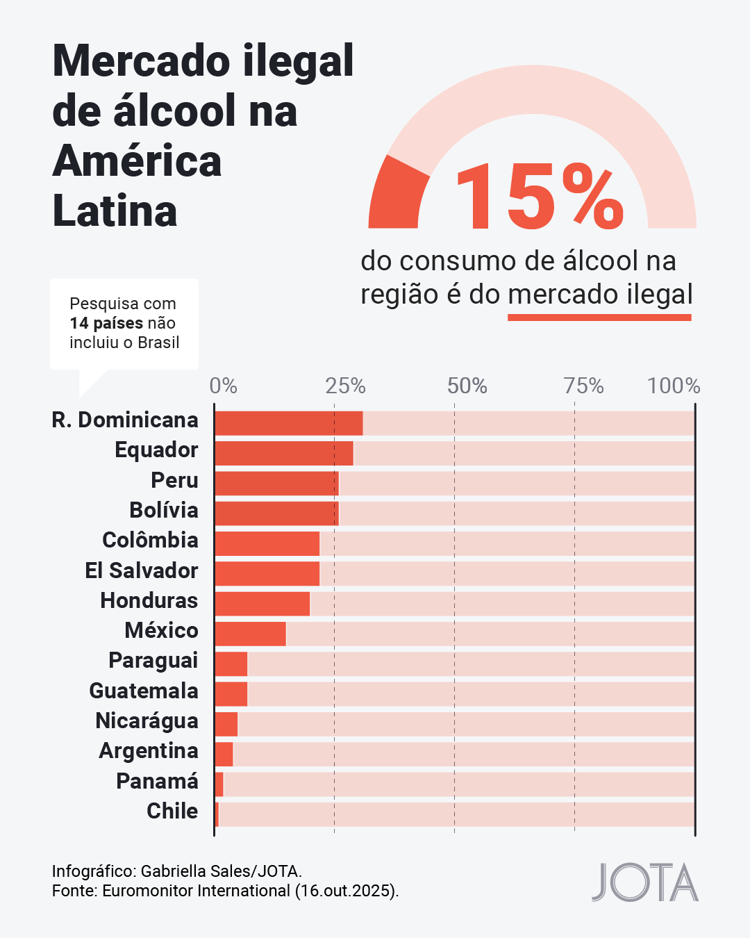 O estudo global mais abrangente especificamente sobre o mercado de álcool, produzido pelo instituto de pesquisa Euromonitor em 2018, mostra o tamanho e o formato do mercado ilegal de álcool no mundo. Entre os 14 países analisados na América Latina, as duas piores posições (com maior mercado ilegal) são ocupadas por Equador, onde 29% do consumo total de álcool vem do mercado ilegal, e República Dominicana, onde esse índice é de 31%. Ambos usam sistemas físicos de controle tributário. A lista não avaliou o Brasil.
