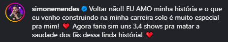 “Voltar não! Eu amo minha história e o que eu venho construindo na minha carreira solo é muito especial pra mim! Mas eu faria sim uns 3 ou 4 shows pra matar a saudade dos fãs dessa linda história“, escreveu em um comentário.