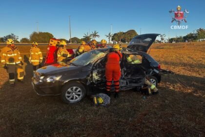 Motorista fica presa às ferragens após bater carro em poste no DF
