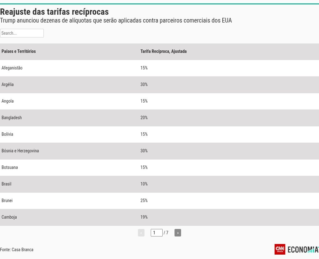 O Brasil aparece na lista com uma alíquota recíproca de 10%. Contudo, desde quarta-feira (6), o país já é alvo de uma sobretaxa de 40 pontos percentuais, totalizando 50%.