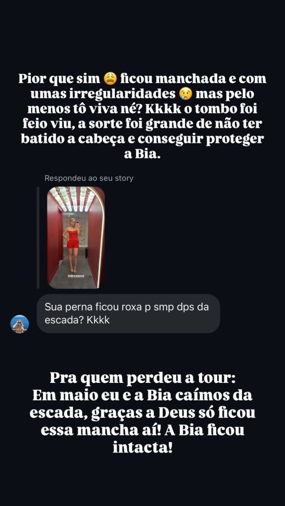 Em resposta a seguidora, disse: “Pior que sim, ficou manchada e com umas irregularidades, mas pelo menos tô viva, né? O tombo foi feio, viu, a sorte foi grande de não ter batido a cabeça e conseguir proteger a Bia.”