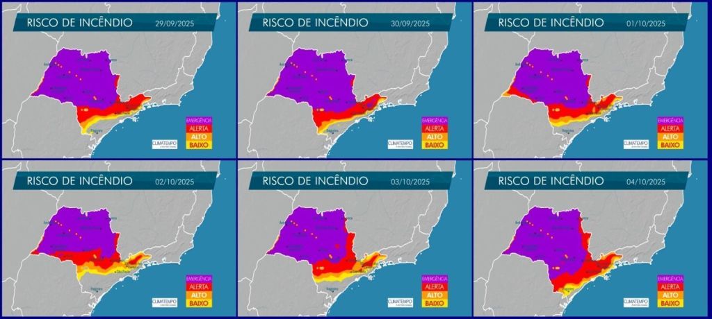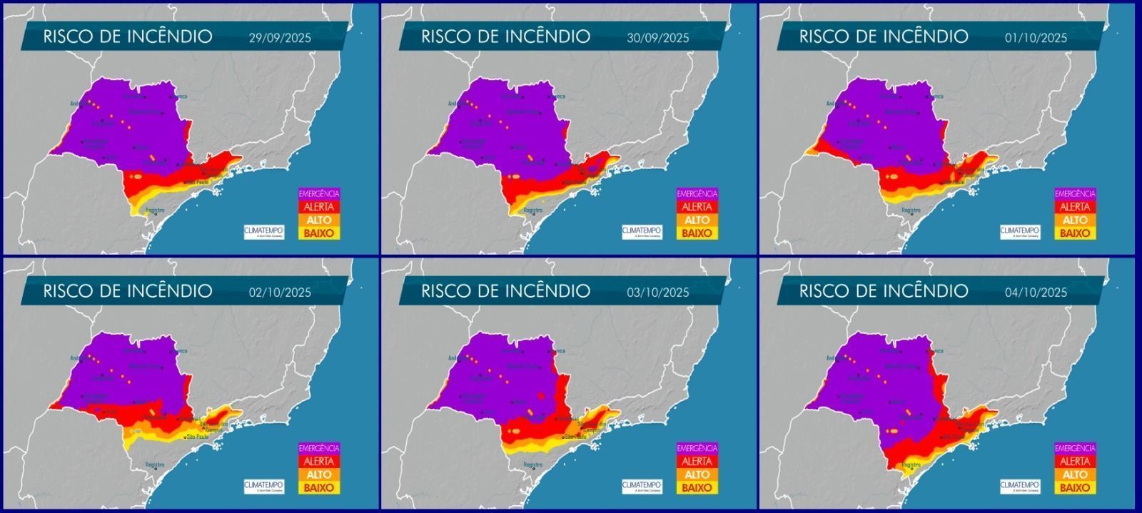 O estado de São Paulo deve ter temperaturas elevadas e baixos índices de umidade do ar nos próximos dias, o que aumenta o risco de queimadas na região. A Defesa Civil emitiu um alerta com as cidades que estão em nível de emergência, pelo menos até a próximo sábado (4).