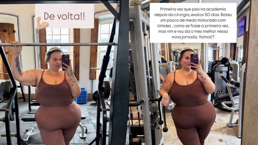 A influenciadora Thais Carla, 33, deu detalhes de sua rotina de treinamentos nesta terça-feira (17), marcando seu retorno para a academia após quase dois meses de uma cirurgia bariátrica.