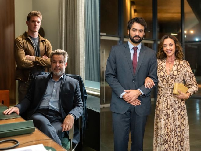 3 de 10Os poderosos Leonardo (Pedro Novaes) e Santiago Ferette (Murilo Benício); e José Maria (Túlio Starling) e Xênica (Carla Marins), funcionários da Fundação Ferrete em “Três Graças” • Estevam Avellar/Globo