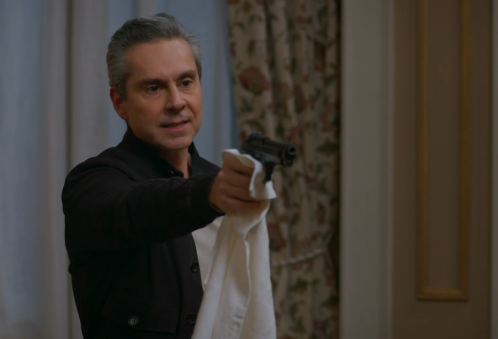 Neste apartamento, Odete (Beatriz Segall) questiona Marco Aurélio onde estão US$ 12 milhões de dólares que ele roubou e o xinga. Ela vai para outro ambiente do imóvel, Leila toca a campainha desesperada, entra e pega um revólver. O empresário não entende do que ela está falando e, ao ver uma sombra, Leila atira, atingindo Odete. “Está vendo o que você fez”, grita ele. A cena volta para o presente, Marco Aurélio chega e os dois se abraçam.