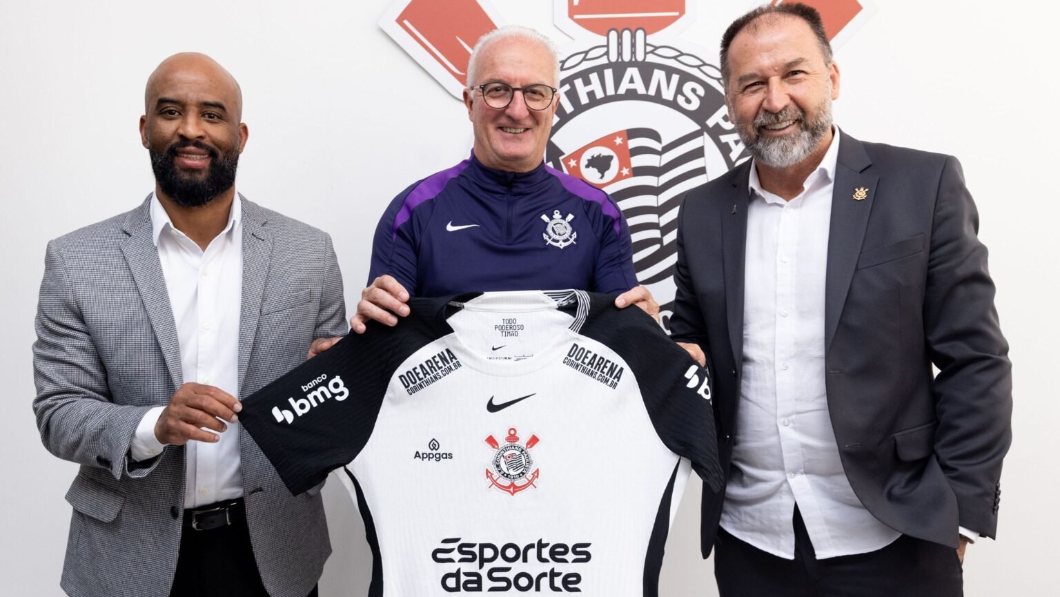 No anúncio, o ex-técnico da Seleção Brasileira posou ao lado de Fabinho Soldado, diretor executivo do Corinthians e Augusto Melo, presidente do clube.