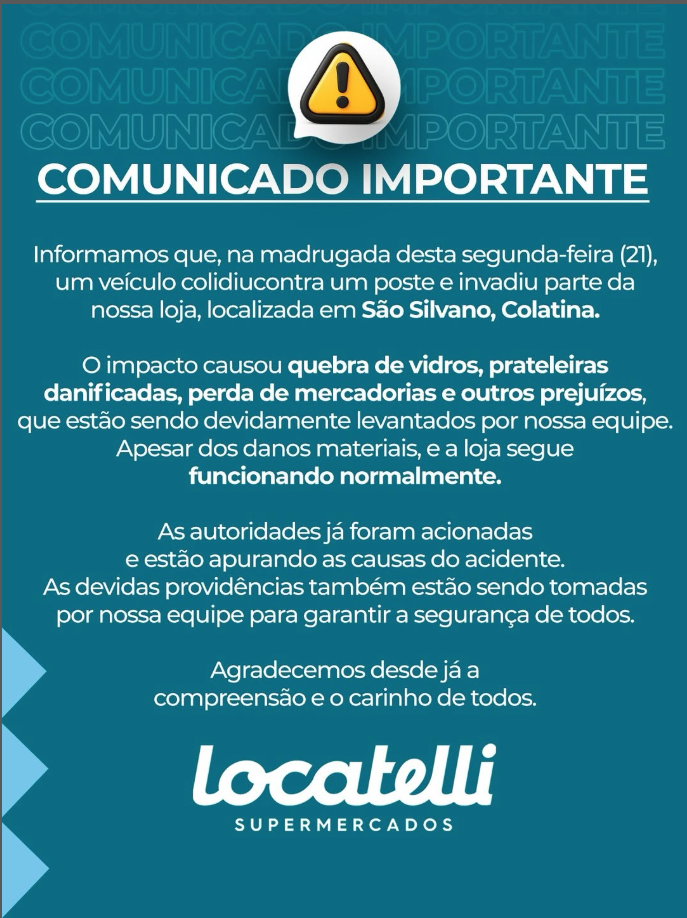 Nas redes sociais, o Supermercado Locatelli Colatina — local em que o acidente ocorreu — informou que foram danificados vidros, prateleiras, mercadorias, entre outros. Apesar dos danos, o estabelecimento segue funcionando normalmente. Veja abaixo: