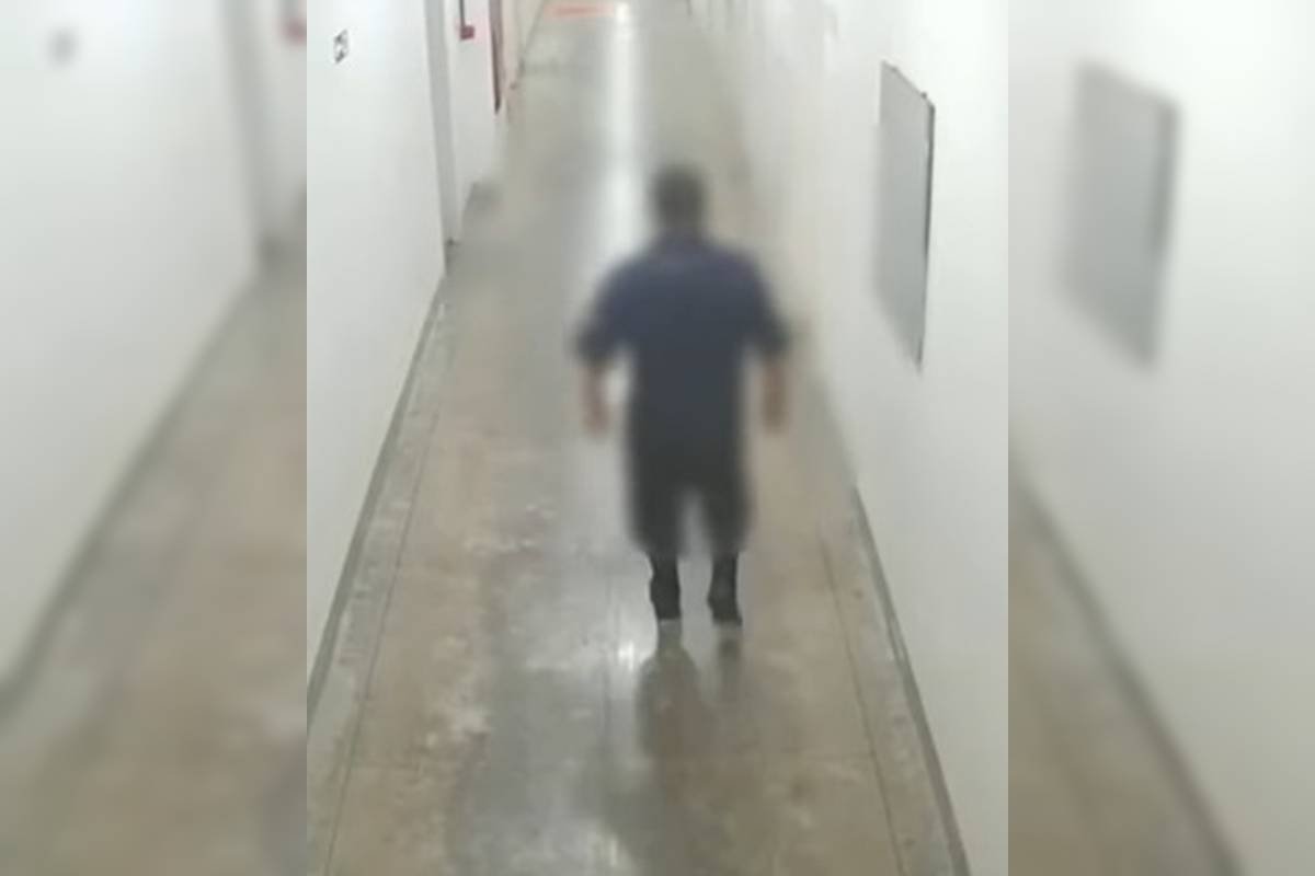 Imagens de uma câmera de segurança mostram o momento em que o funcionário passa pelo corredor da unidade de saúde e vai em direção a um dos quartos.