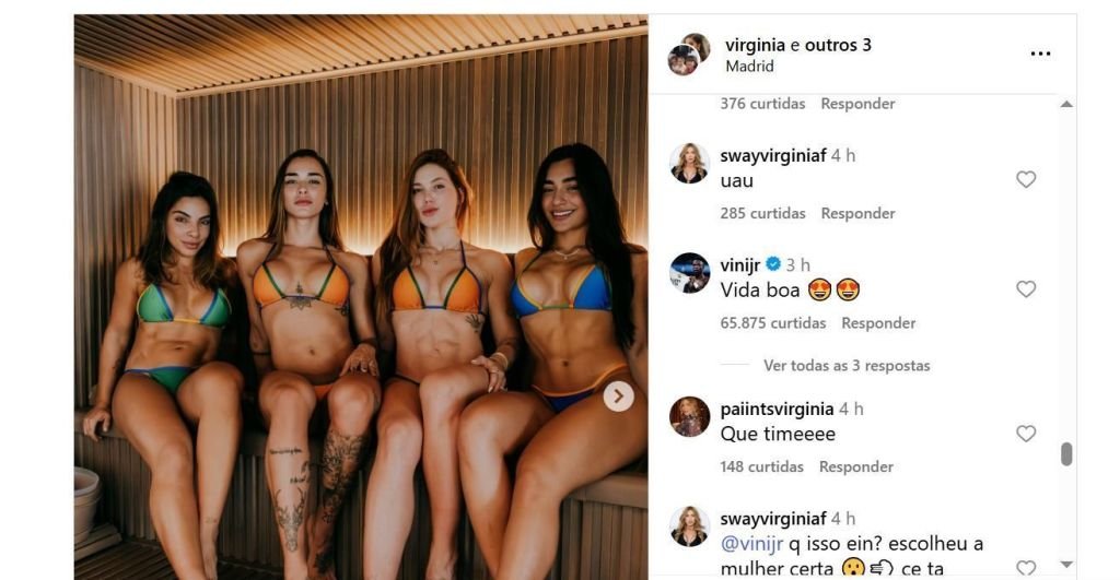 Nesta sexta, a influenciadora, ex do cantor Zé Felipe, postou fotos de biquina na mansão de Vini Jr. O atacante reagiu à publicação escrevendo: “Vida boa!”, com emojis de olhos apaixonados.