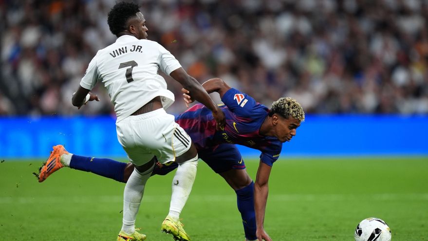 7 de 13Vini Jr. tenta desarme em Yamal no clássico entre Real Madrid e Barcelona • Angel Martinez/Getty Images