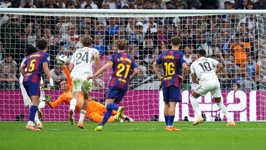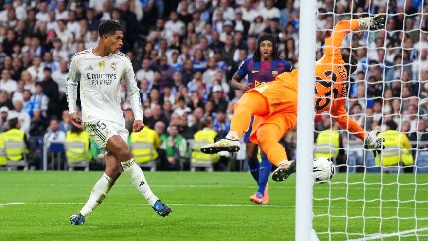 10 de 13Bellingham finaliza para marcar gol do Real Madrid no clássico contra o Barcelona • David Ramos/Getty Images