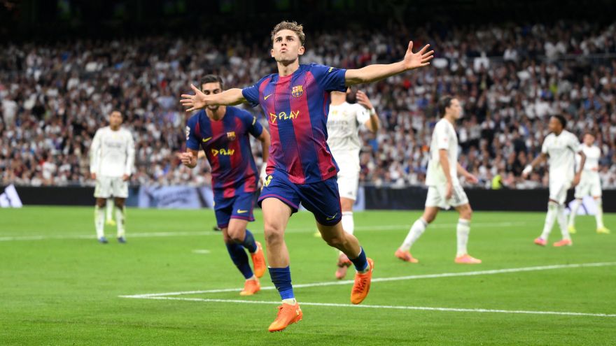 12 de 13Fermín López comemora gol do Barcelona no clássico contra o Real Madrid • David Ramos/Getty Images