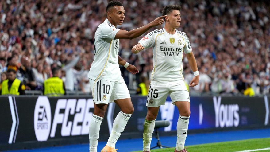 13 de 13Mbappé e Arda Güler comemoram gol do Real Madrid contra o Barcelona • Angel Martinez/Getty Images
