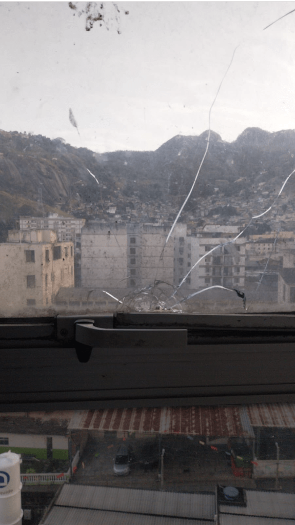 Janela do 5º andar do Hospital do Andaraí (RJ) atingida por disparos de arma de fogo, após reinauguração com o Ministro da Saúde. • Reprodução Redes Sociais