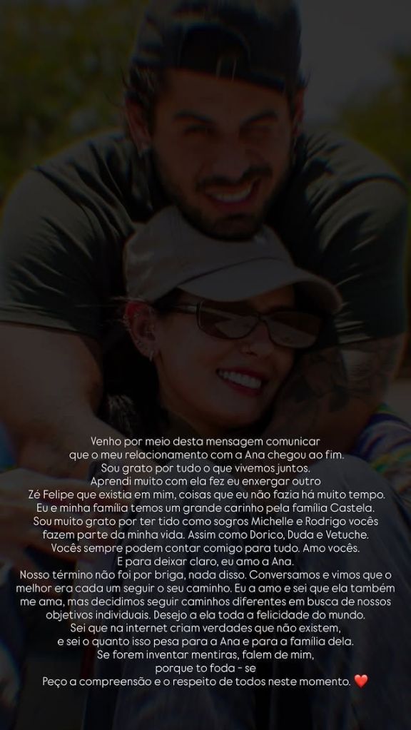 O cantor publicou um story no Instagram afirmando que o namoro entre os artistas chegou ao fim. “Sou grato por tudo que vivemos juntos. Aprendi muito com ela. Me fez enxergar outro Zé Felipe que existia em mim, coisas que eu não fazia há muito tempo.”